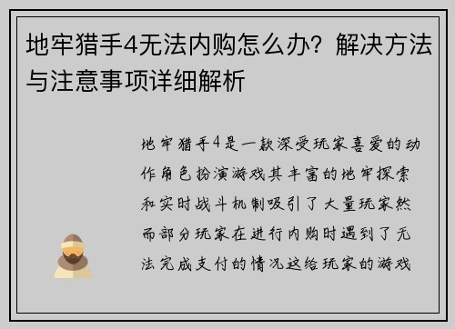 地牢猎手4无法内购怎么办?解决方法与注意事项详细解析
